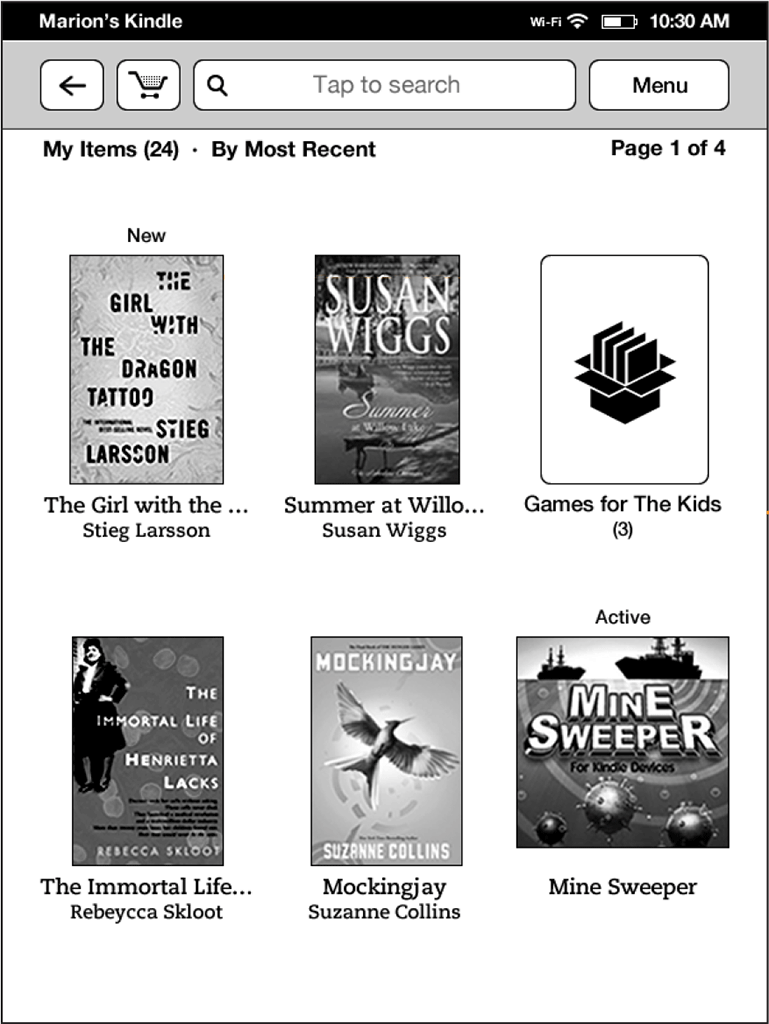 I tweaked the old Kindle Touch layout (see below) as part of the UI effort. Book covers were made larger and now included progress indicators. I removed the ever-present Search field to make room for important new features. And swapping Futura for Helvetica added personality.