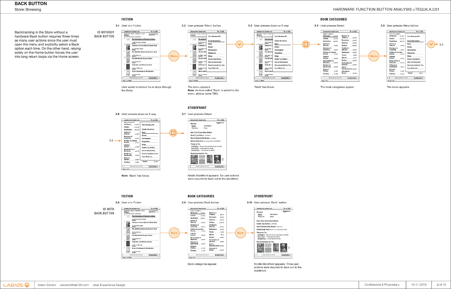 This example compares two- and four-button UX for navigating through the Kindle Store. With a dedicated Back button, returning to the storefront required two button presses. Without a dedicated Back button, it required six button presses.