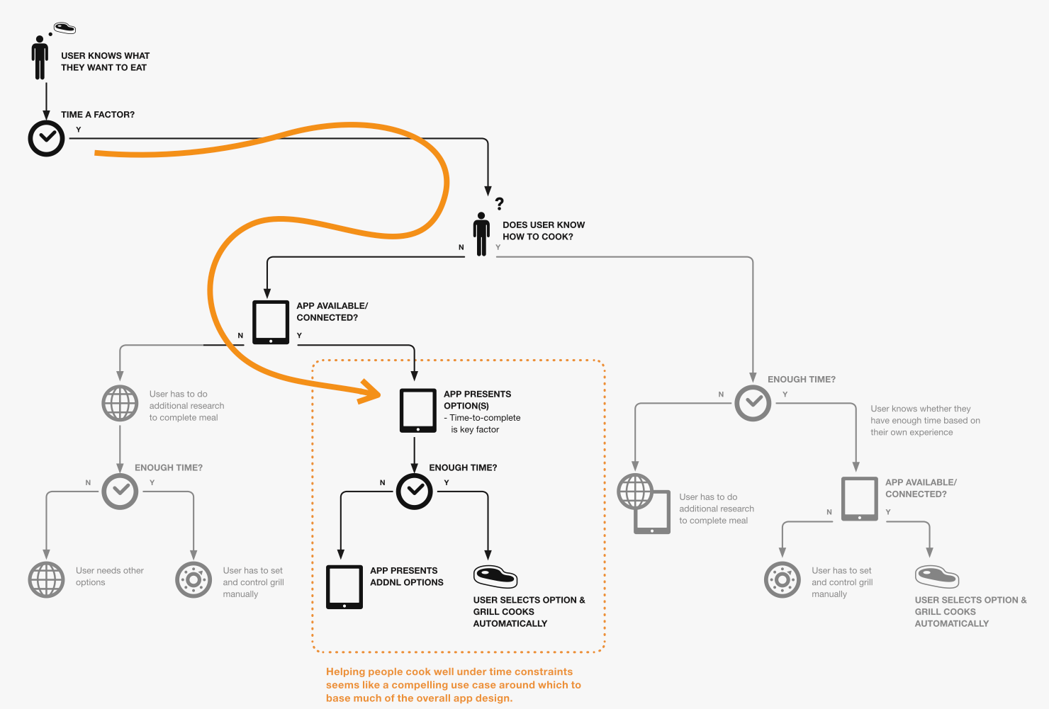 It turned out that it was possible, but not optimal, to design a simple, hardware-only smart grill UX. I added a mobile app back into the larger interaction analysis. So, for a hungry user who wanted to eat at a specific time the functional flow looked like this: